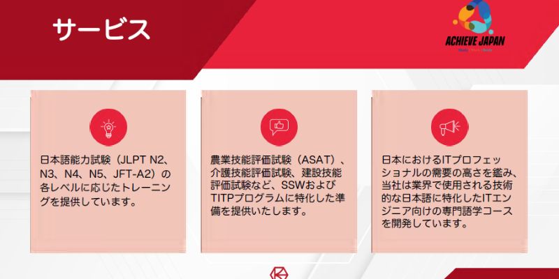 独自のトレーニングセンター「ACHIEVE JAPAN」や「Kawaii Japan – RISDA TREDMIGトレーニングセンター」を運営し、日本へ派遣する前に徹底した準備教育を行っています 。